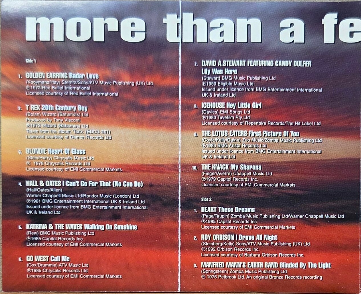 GOLDEN EARRING - Radar Love / T REX - 20th Century Boy / BLONDIE - Heart Of Glass / HALL & OATES - I Can't Go For That (No Can Do) / KATRINA & THE WAVES - Walking On Sunshine / GO WEST - Call Me / DAVID A. STEWART FEAT. CANDY DULFER - Lily Was Here / ICEHOUSE - Hey Little Girl / THE LOTUS EATERS - The First Picture Of You / THE KNACK - My Sharona